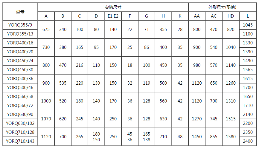 表1 YORQ短系列永磁耦合調(diào)速器外形及安裝尺寸表(機座號355~630)